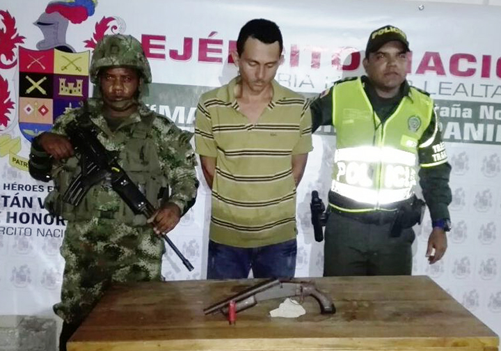 Luego de la denuncia de varios habitantes que manifestaron ser víctimas de dos asaltantes en en la vereda la Unión, jurisdicción del corregimiento de Guachaca, Magdalena; El ejército jército Nacional, en coordinación con la Policía Nacional, lograron la captura de un hombre por el delito de fabricación, tráfico, porte o tenencia de armas de fuego o municiones.