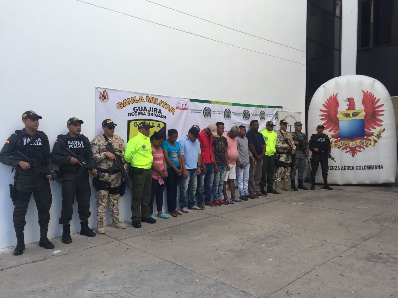 En una operación conjunta, coordinada e interagencial entre la Fuerza Aérea Colombiana, el Ejército, la Policía Nacional y la Fiscalía en Riohacha, departamento de la Guajira, se logró la captura de 08 personas integrantes del Grupo Delictivo Organizado Clan del Golfo, quienes tienen orden de captura vigente por los delitos de concierto para delinquir y extorsión agravado.