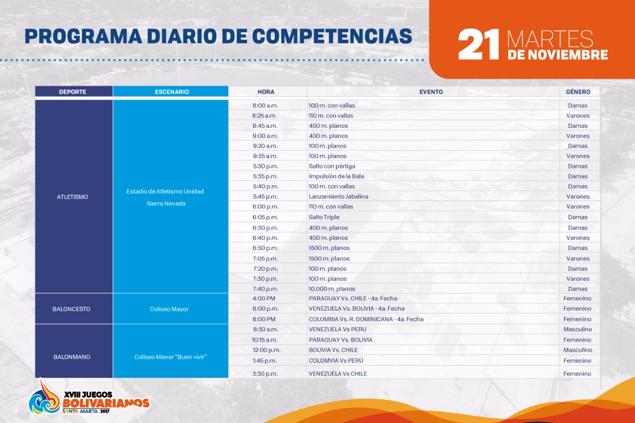 Deportes Conozca la programación de los JJBB2017 para este martes Published 8 años ago on 21/11/2017 By elcallejero Related Topics: You may like Advertisement Lo último Magdalena1 día ago Gobernación del Magdalena inicia obras de pavimentación en el barrio Villa Dania Magdalena1 día ago Gobernación invierte $578 millones en dotación para el Hospital de Remolino Judiciales1 día ago A bala asesinan a hombre en zona cafetera de la Sierra Nevada Magdalena1 día ago Autoridades refuerzan seguridad electoral en Santa Marta y ocho municipios del Magdalena Judiciales2 días ago Sicarios irrumpen en una vivienda y hieren de gravedad a dos hermanos en Puebloviejo Magdalena2 días ago Gobernación del Magdalena anuncia $33 mil millones para combatir la delincuencia