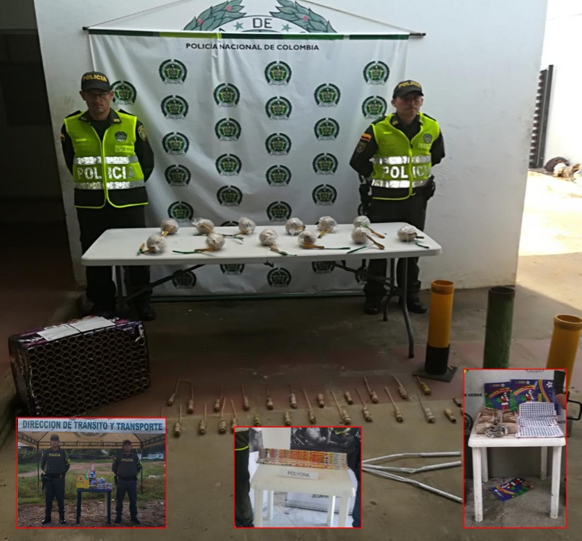 La otra incautación se dio en la vía El Banco – Chimichagua (Cesar), donde un sujeto transportaba una bolsa cerca de 380 unidades productos pirotécnicos como volcanes, golpes, velas craquert, voladores de cinco golpes, tortas de 25 tiros cada una, cajas de chispitas mariposa, volcanes pequeños, metralletas, tortas de 96 tiros con un peso de 5000 gramos.