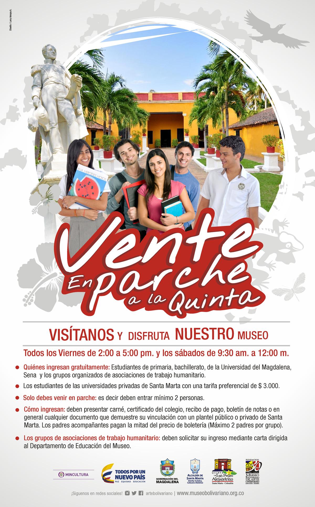 Todos los viernes de 2:00 p.m. a 4:30 p.m. y sábados de 9:30 a.m. a 12:00 m. y hasta el 10 de noviembre 2018, estudiantes de colegios públicos y privados de Santa Marta y el Magdalena entran GRATIS a las Quinta de San Pedro Alejandrino.