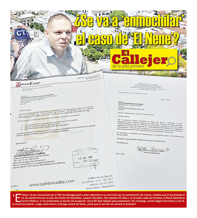 ‘El Nene’ de ser reconocido por el PAE de Ciénaga pasó a estar detenido en su domicilio por la contratación del mismo, medida que le fue dictada el 11 de septiembre por el juez de Control de Garantías, Joaquín González. Han pasado 45 días y no se sabe nada del proceso, el fiscal Salustiano Fortich Medina, no ha presentado el escrito de acusación, tiene 90 días hábiles para presentarlo. Sin embargo, pronto llegará diciembre y con él, la vacancia judicial. Luego viene enero y Ciénaga estará de fiesta, ¿será que el caimán se comerá el proceso?