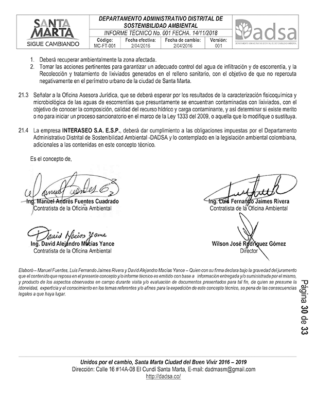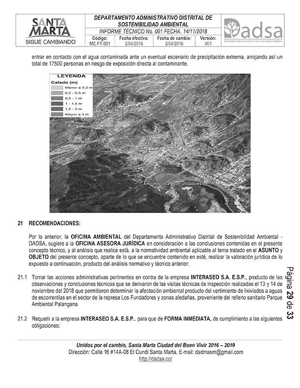 Este documento señala, que “la empresa Interaseo SA ESP propietaria y responsable del relleno sanitario Parque Ambiental Palangana guardó silencio y jamás informó a las autoridades ambientales sobre el derramamiento de lixiviados, a efectos de que se dispusieran de los planes de contingencia para atender la emergencia y con ello proteger a la población potencialmente afectada”.
