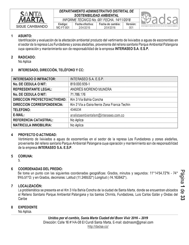 Un informe técnico levantado por el Departamento Administrativo Distrital de Sostenibilidad Ambiental -Dadsa- de Santa Marta dejó al descubierto la gran responsabilidad que le asiste a Interaseo SA ESP en el vertimiento de lixiviados del relleno sanitario ‘Parque Ambiental Palangana’ a las aguas superficiales y canales que componen la represa Los Fundadores al guardar silencio sobre este hecho que afecta no solo la salud de los pobladores de la Localidad 2, sino el daño irreparable al medioambiente.