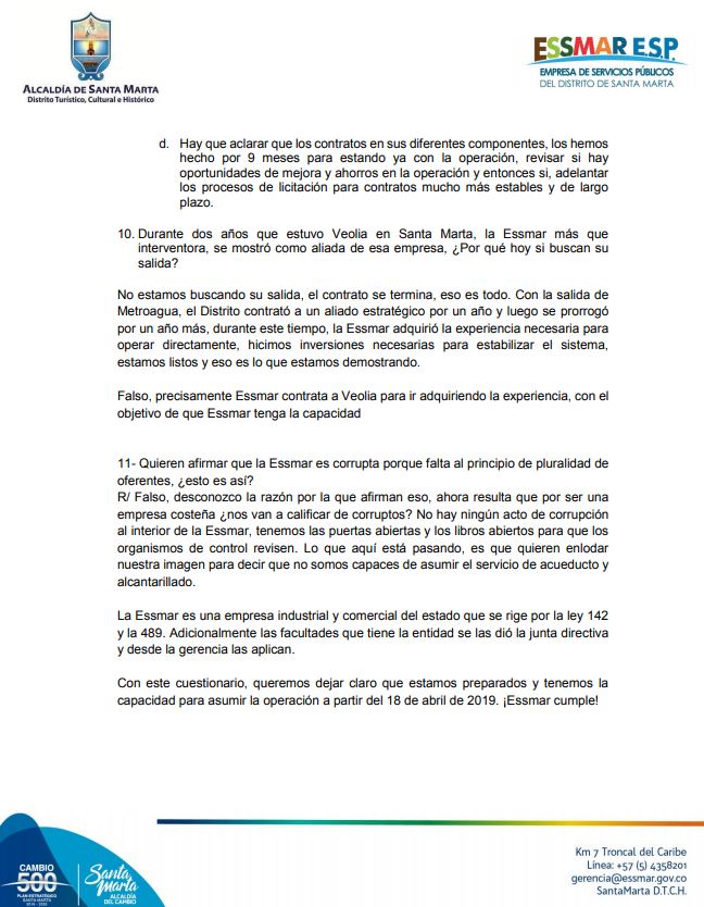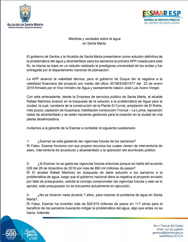 Uncategorized ¿Sabe cuáles son las mentiras y verdades sobre el agua en Santa Marta ? Published 7 años ago on 15/04/2019 By elcallejero Related Topics: You may like Advertisement Lo último Santa Marta2 días ago Jornada de limpieza en monumento reabre debate sobre cultura ciudadana en Santa Marta Judiciales2 días ago Madrugada de terror en Taganga: balas apagaron dos vidas Judiciales3 días ago Con panfletos y plata en mano: así cayó alias “Jesús”, presunto extorsionista Magdalena3 días ago Puente de La Piragua: la alternativa que desembotellará el tráfico de hasta 30 mil vehículos diarios Magdalena3 días ago La gobernadora Margarita Guerra llevó ayudas humanitarias a 220 familias damnificadas Lo Último4 días ago Incendio en condominio del Rodadero generó momentos de tensión