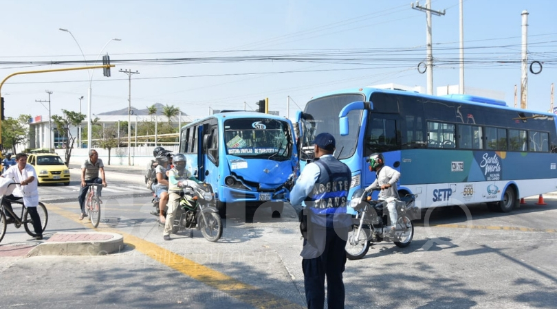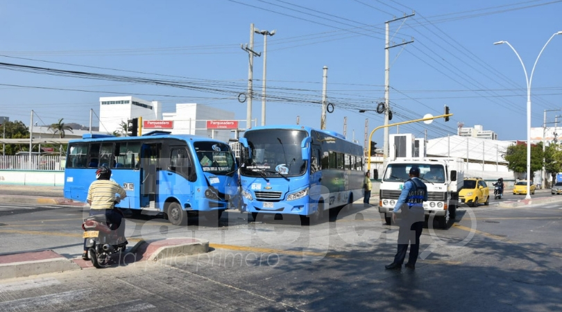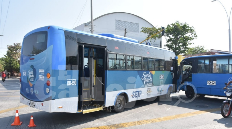 La imagen fue captada por nuestro reportero y muestra la imprudencia de dos conductores del transporte público de Santa Marta. Ambos se chocaron y quedaron justo en la mitad de varios semáforos ?.