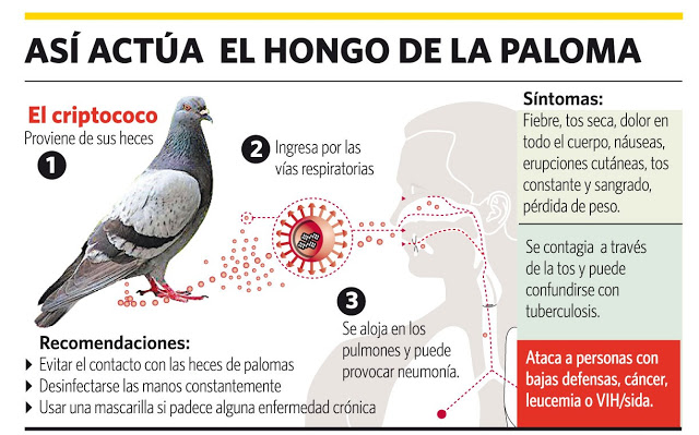 En el caso de la enfermedad de las palomas, la Criptococosis, es la infección producida por hongos: Cryptococcus neoformans o cryptococcus gattii, que afecta al sistema nervioso central. Habitan en los suelos de los lugares contaminados con excrementos de palomas y aves. Se trasmiten al hombre y otros mamíferos por vías respiratorias.