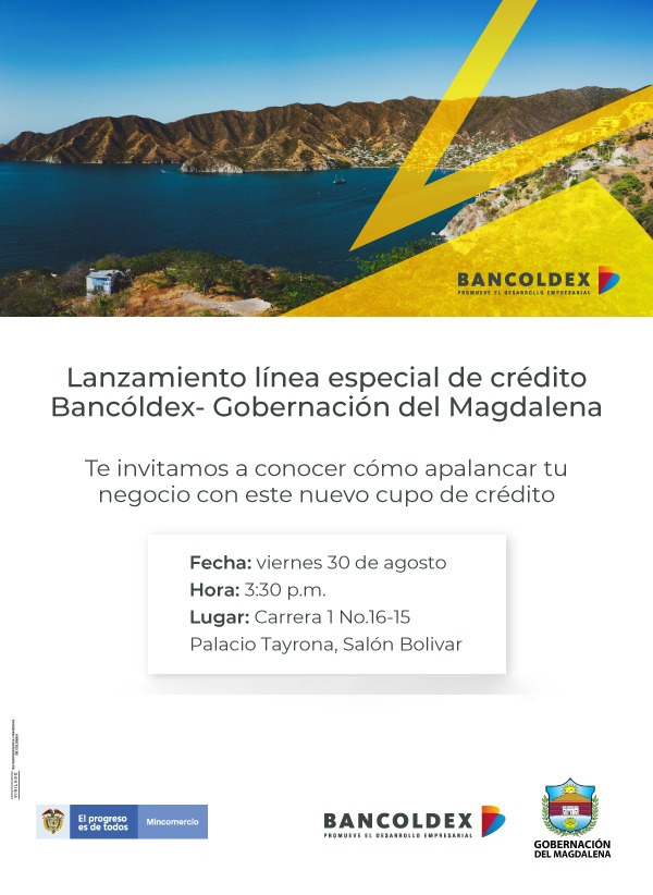 Bancóldex, el banco de desarrollo empresarial de Colombia, y la Gobernación del Magdalena ponen a disposición de los micro y pequeños empresarios del Magdalena un cupo especial de crédito por $5.000 millones de pesos en condiciones adecuadas para sus inversiones, buscando apoyar la competitividad y el crecimiento de los negocios empresariales.