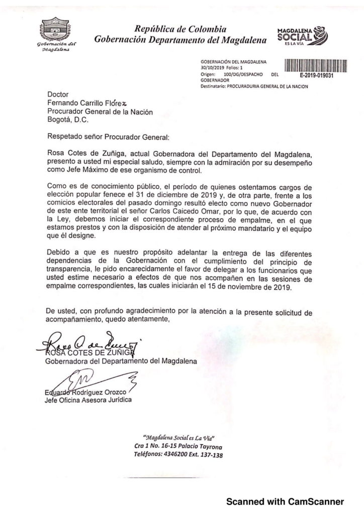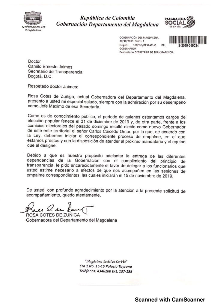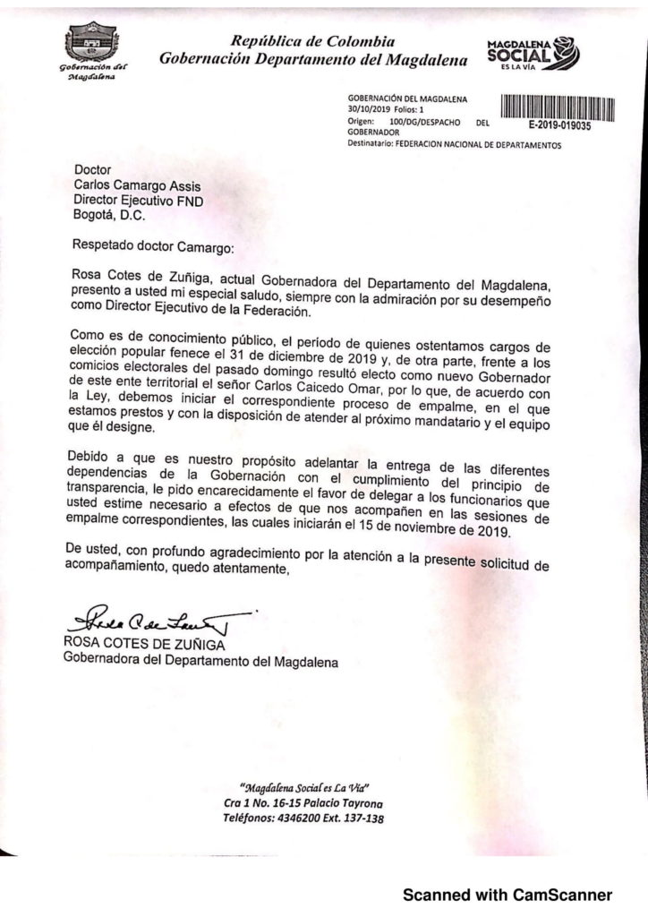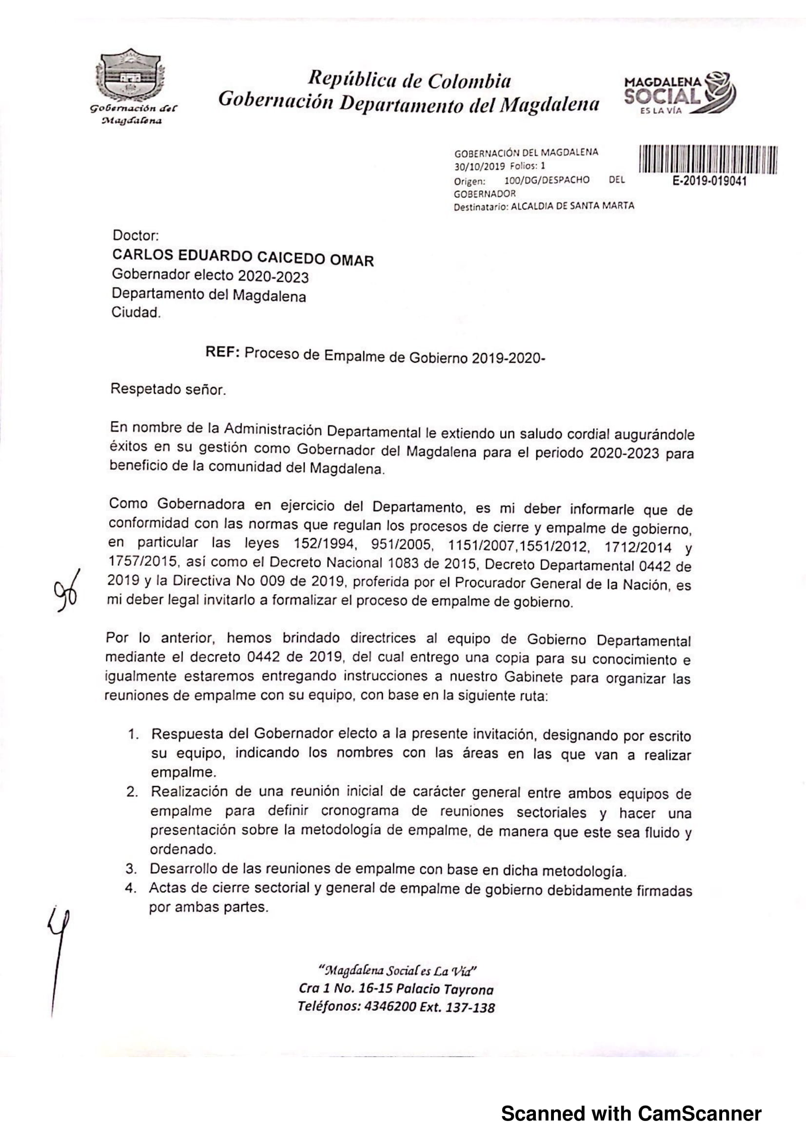 En el oficio enviado a Carlos Caicedo Omar, la Gobernadora propone como fecha formal de inicio del proceso de empalme el próximo 15 de noviembre de 2019, Sin embargo se realizará una reunión previa con el fin de conocer los equipos de comisión de empalme, el 7 de noviembre a las 3 p.m. en el Salón Bolívar del Palacio Tayrona. “Sin objeción que usted y yo nos podamos reunir en fecha previa, para ampliarle aspectos de la metodología y situación general del Departamento, antes de comenzar la dinámica de empalme”, concluyó la mandataria en su comunicación.