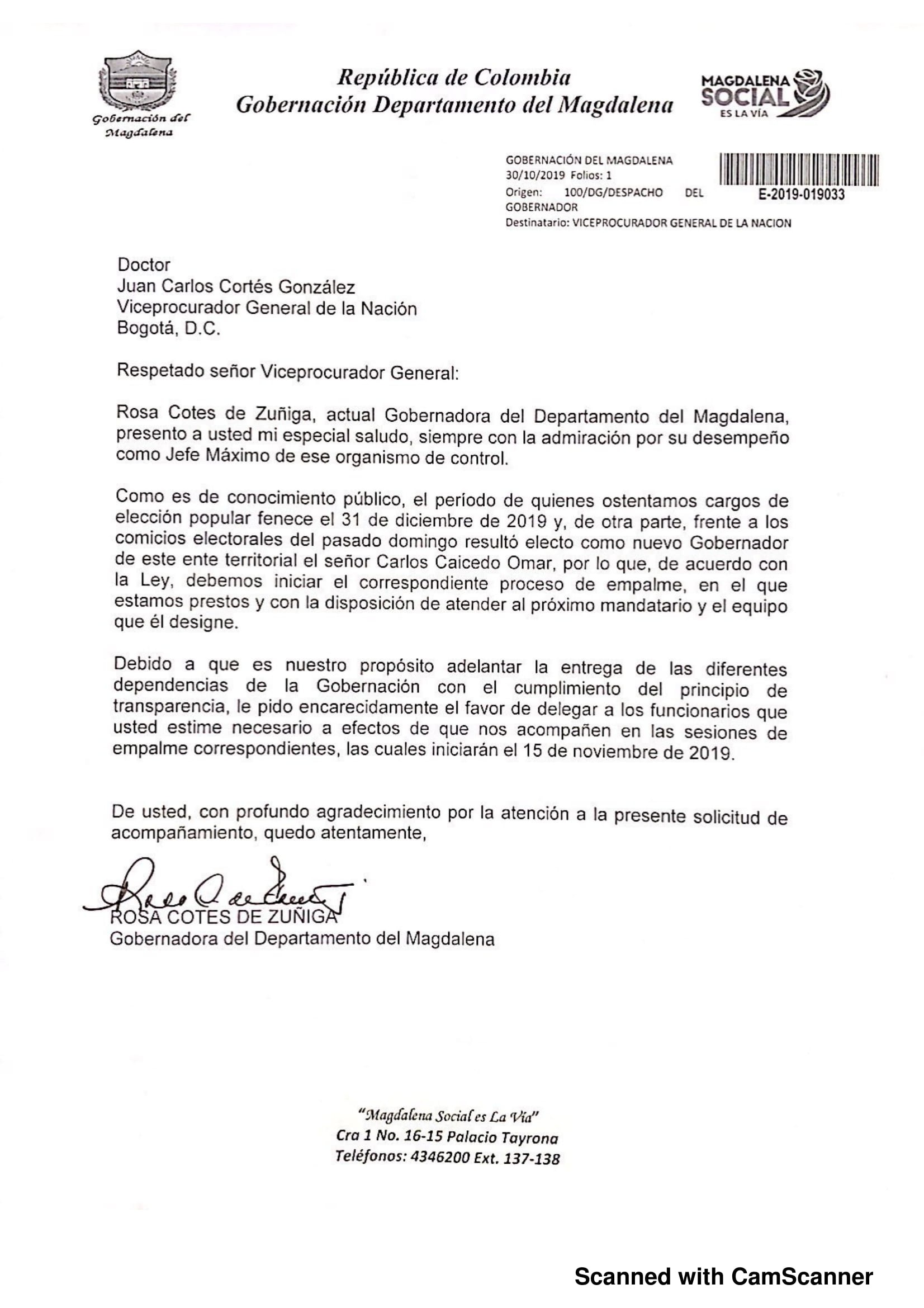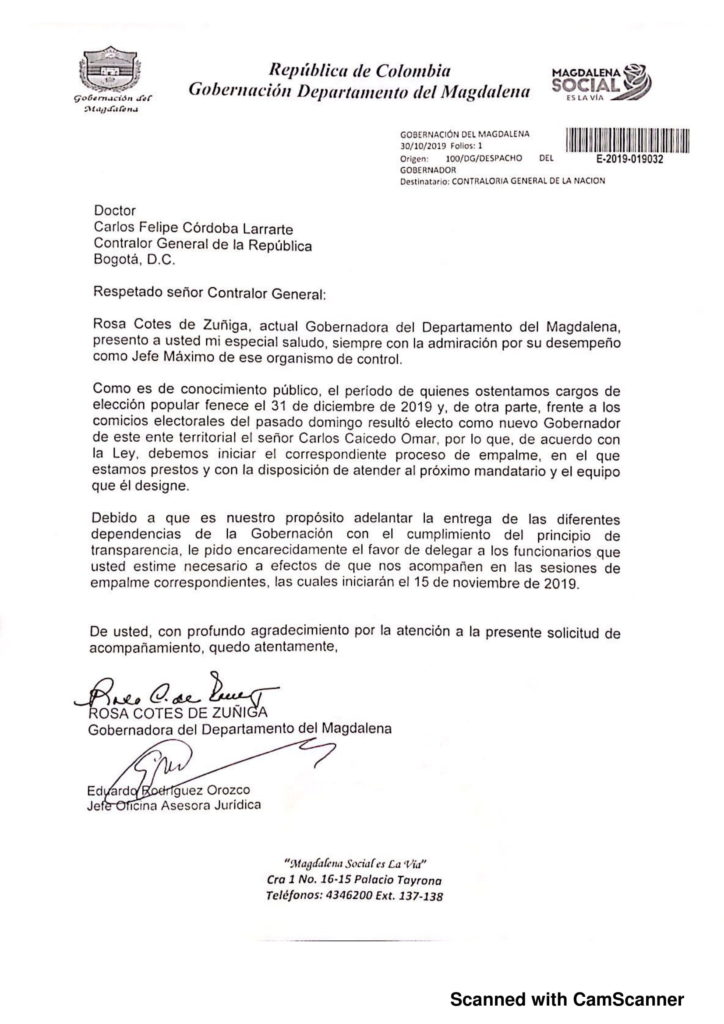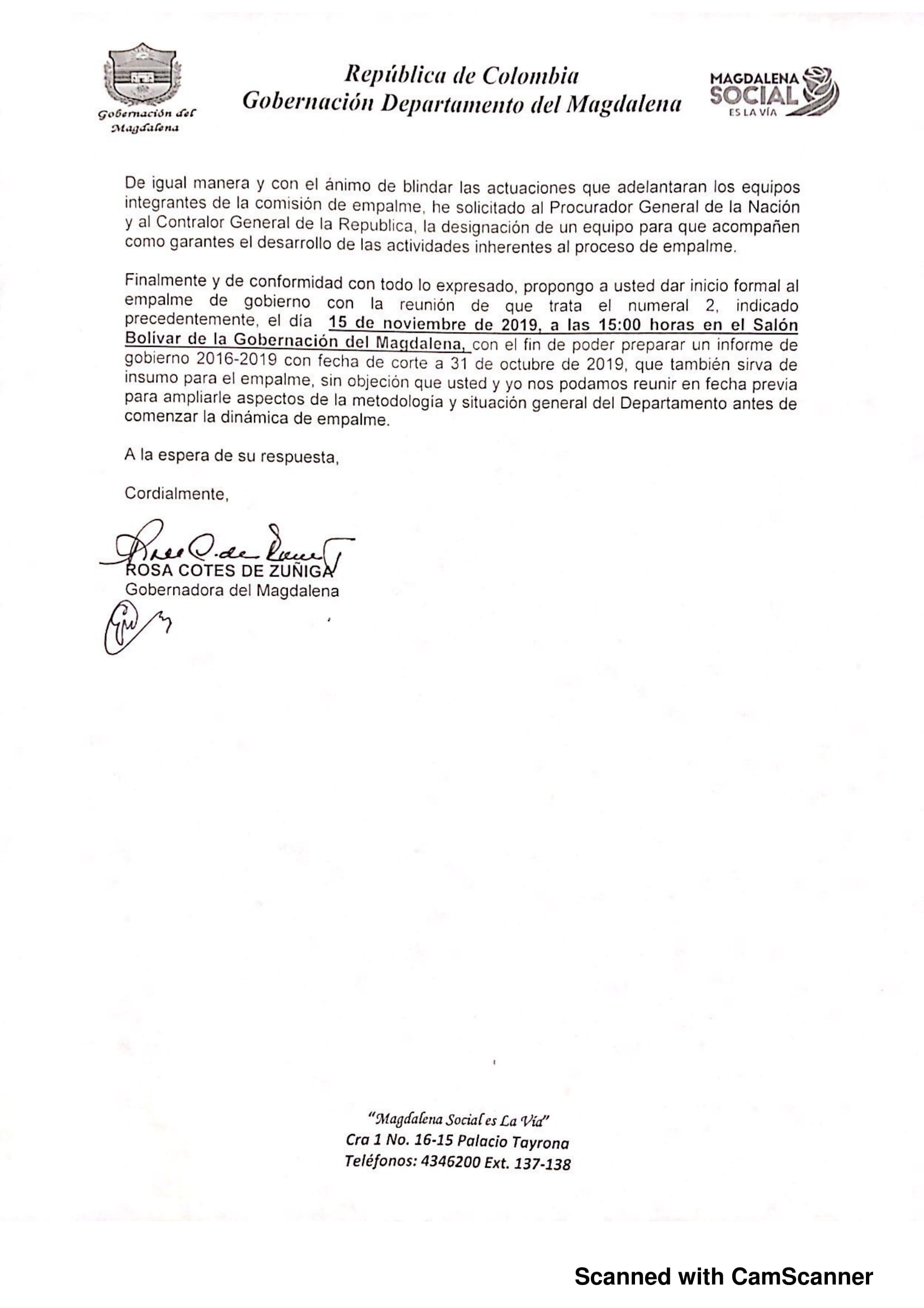 En el oficio enviado a Carlos Caicedo Omar, la Gobernadora propone como fecha formal de inicio del proceso de empalme el próximo 15 de noviembre de 2019, Sin embargo se realizará una reunión previa con el fin de conocer los equipos de comisión de empalme, el 7 de noviembre a las 3 p.m. en el Salón Bolívar del Palacio Tayrona. “Sin objeción que usted y yo nos podamos reunir en fecha previa, para ampliarle aspectos de la metodología y situación general del Departamento, antes de comenzar la dinámica de empalme”, concluyó la mandataria en su comunicación.