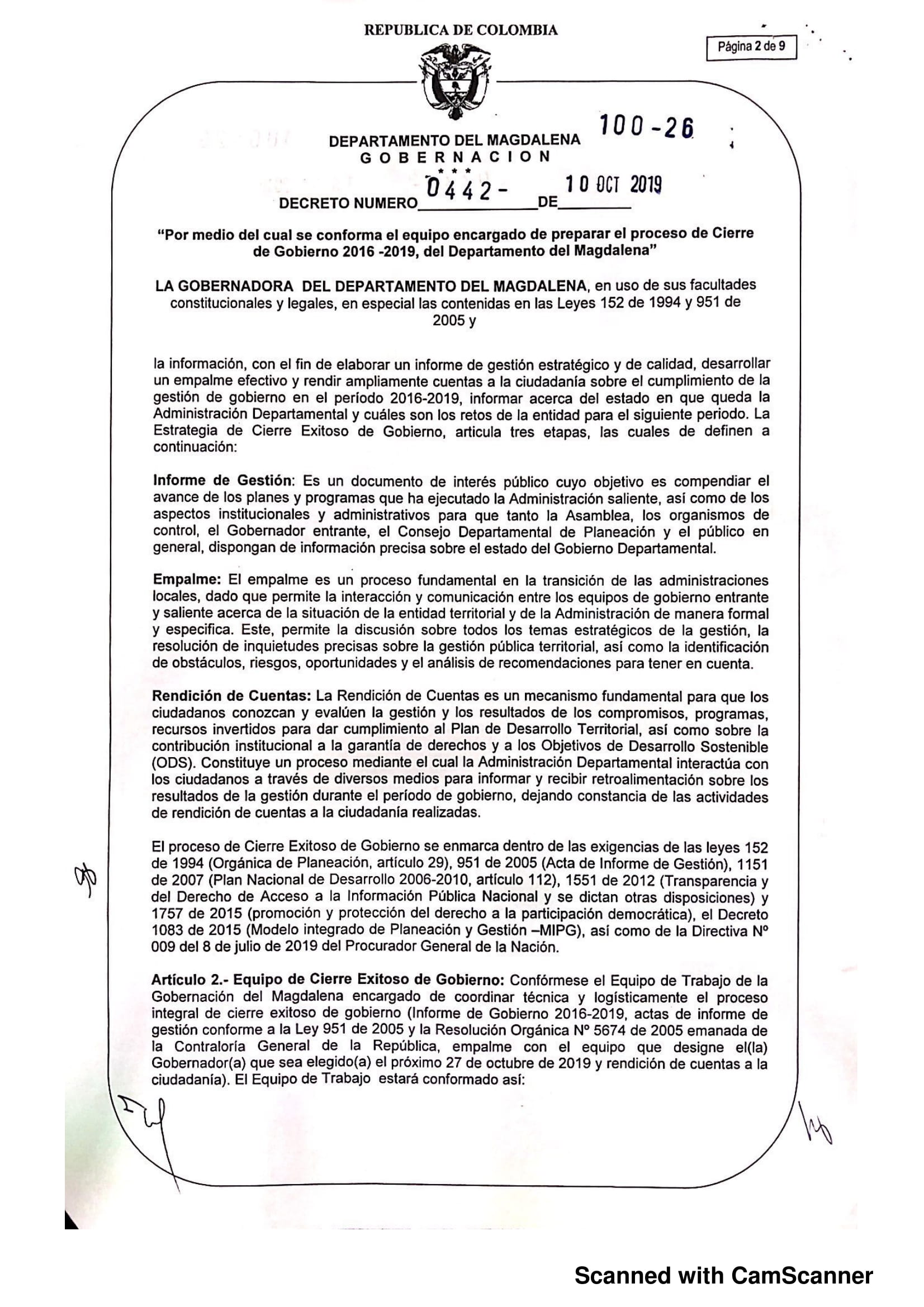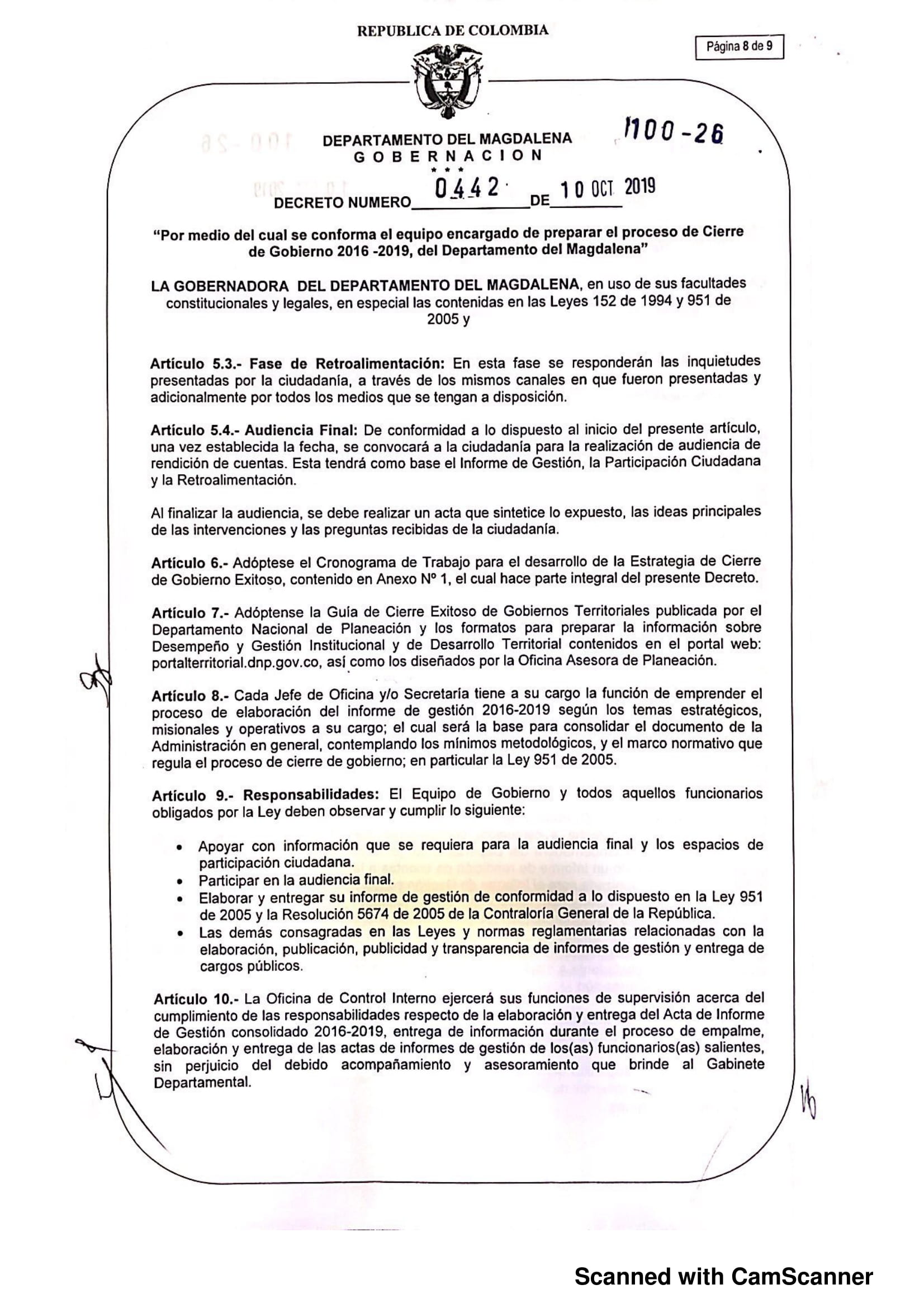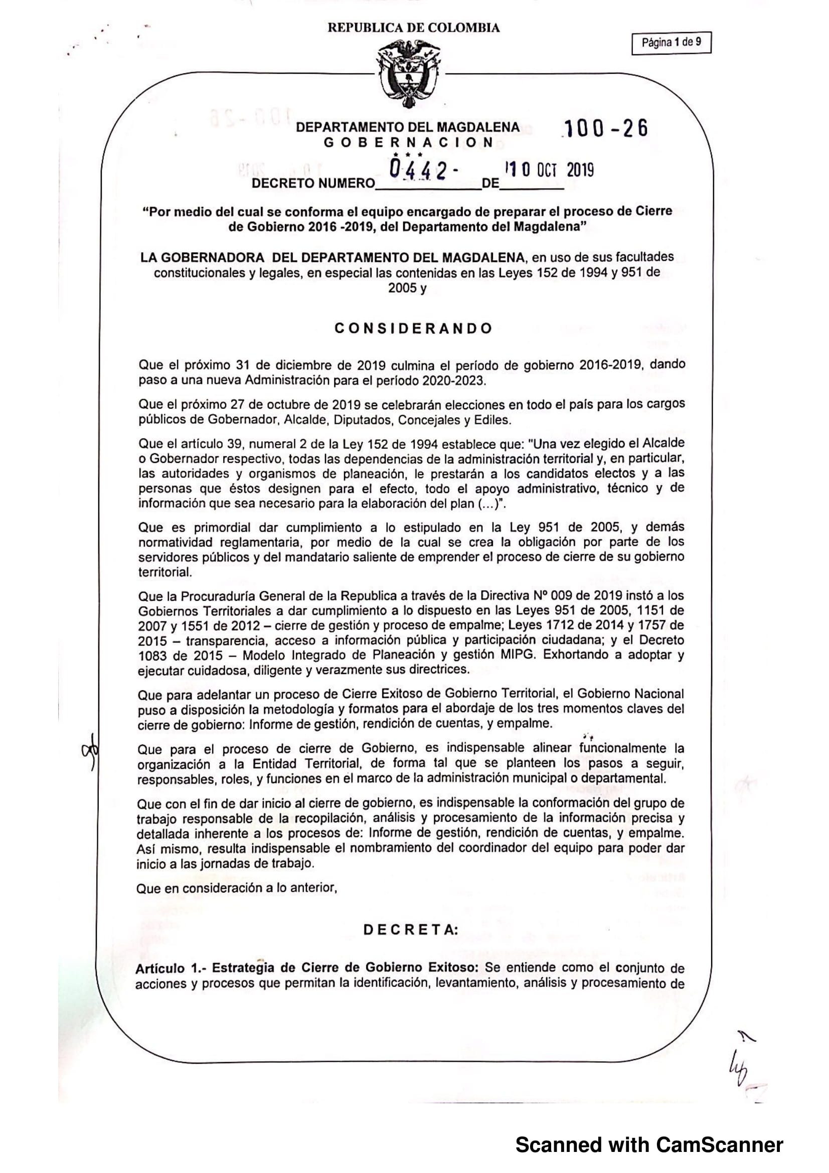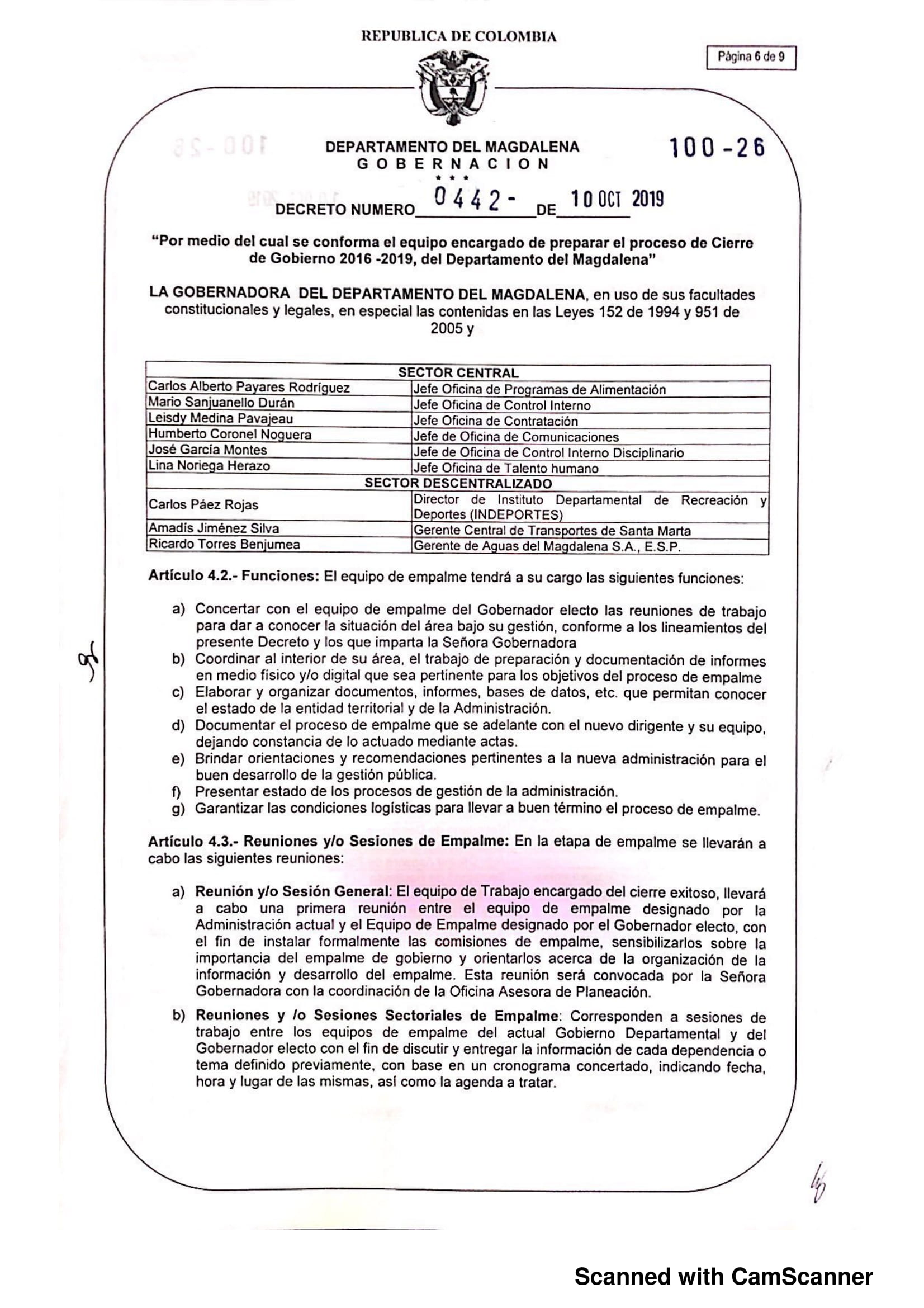 De igual forma, cumpliendo con el principio de transparencia, la Mandataria Departamental, mediante Decreto 0442 del 10 de octubre de 2019, entregó directrices a su equipo de gobierno sobre la dinámica de este ejercicio de empalme, con el objetivo de facilitar el cierre exitoso de la actual administración y el inicio del gobierno entrante.