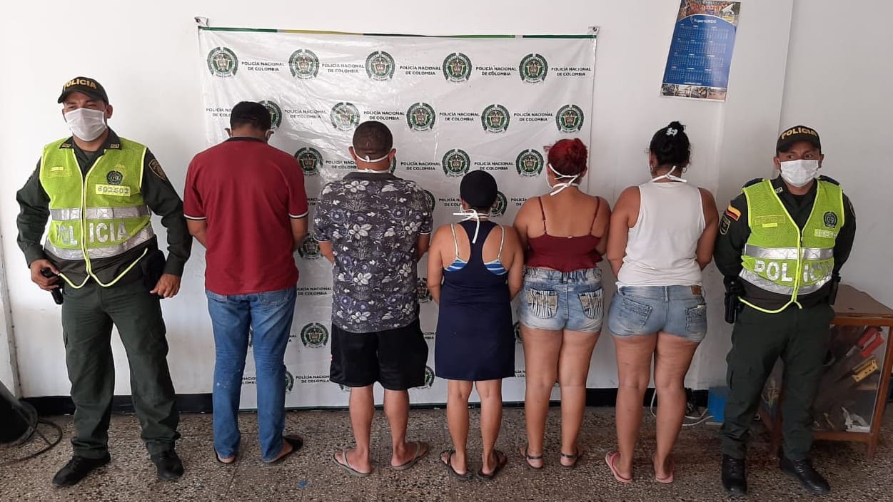 Fue así como los uniformados procedieron a dar captura de estas cinco personas que fueron identificadas como: Emérito Meza Carmona, 45 años de edad, colombiano, Demetrio Salcedo Caro, 48 años, Deisy Buelvas 44 años, Guadalupe Perche Cáceres, de 33 años y Jesussany Díaz Peñalosa, 25 años de edad, estas dos últimas de nacionalidad venezolana, quienes serán puestas a disposición de la Fiscalía General de la Nación, para que respondan por el delito de violación a medida sanitaria, descrita en artículo 368 del código penal.