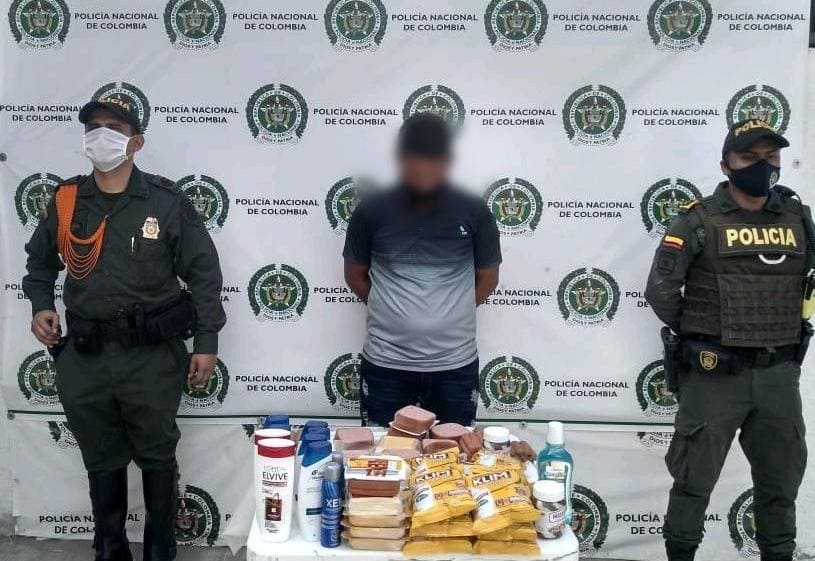 Este sujeto fue al parecer sorprendido en las afuera del almacén con varios productos sin cancelar avaluados en $378.900. Por tal motivo, la Policía le da a conocer los derechos como persona captura por el delito de hurto calificado.