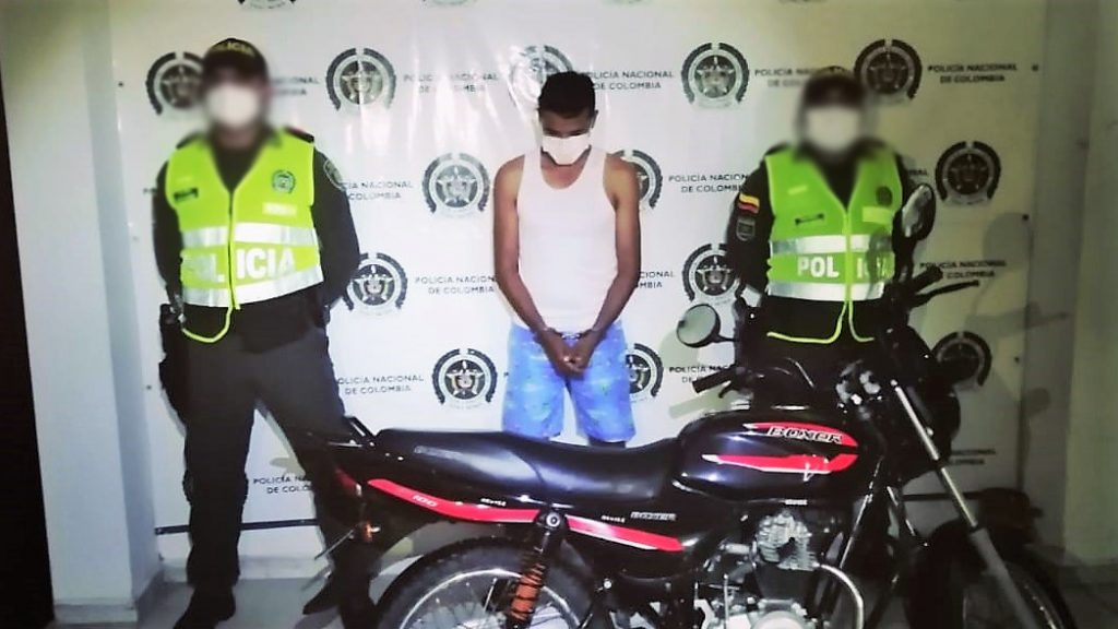 Luego de que los cuadrantes fueran alertados por la central de radio sobre el hurto de una motocicleta a unos jóvenes que se movilizaban en zona rural de Fundación sobre la vía que conduce al municipio de Pivijay, por lo que las patrullas en turno activan el plan candado y cierre de vías, interceptando a uno de los presuntos delincuentes en la trocha que comunica al barrio Las Palmas en Fundación, cuando iba a bordo de la moto robada de placa HWY-32D, siendo detenido de inmediato e identificado como Jorge Eliecer Sanchez Ospino de 33 años y al ser requisado le hallan una pistola de aire comprimido con la que amedrantaron a los ocupantes para hurtarle la moto, siendo dejado a disposición por hurto ante la Fiscalía.