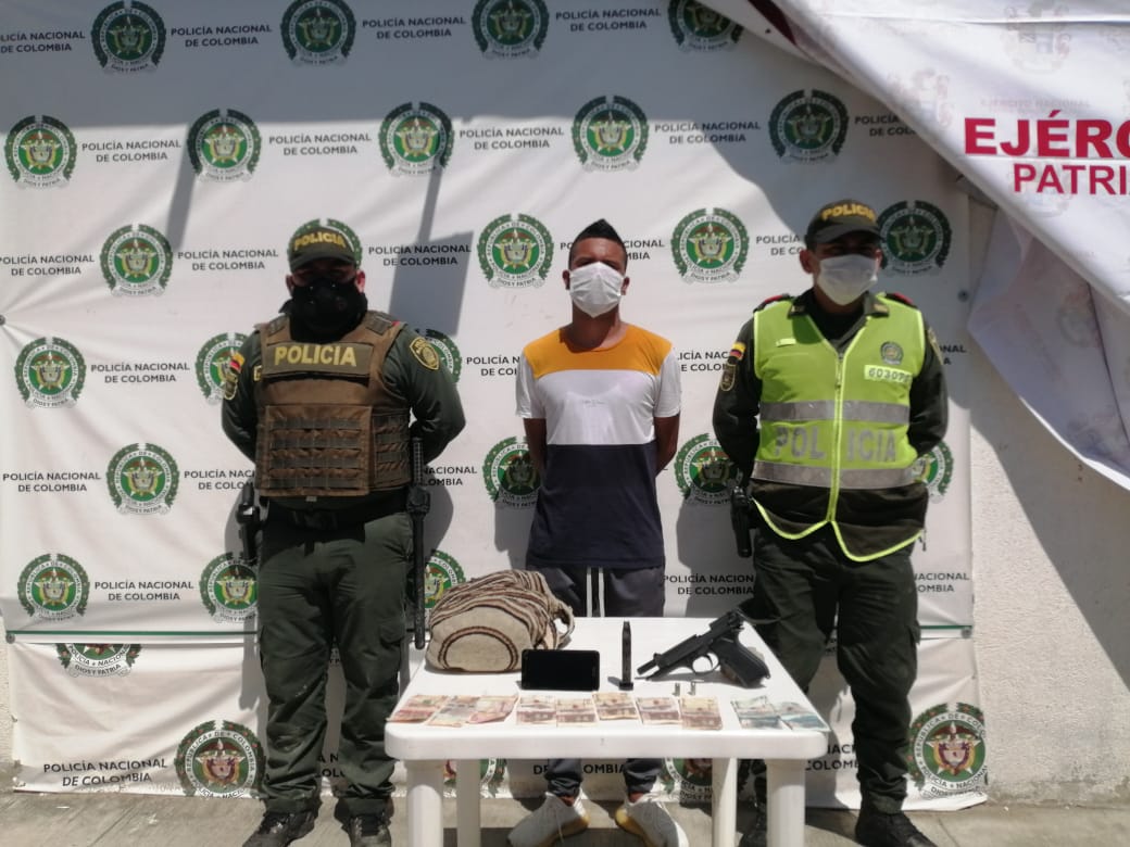 Posteriormente las autoridades proceden a practicar el registro personal del caso, hallando bajo el poder de estos sujetos, un arma tipo pistola y una mochila con un teléfono celular, dinero en efectivo y elementos varios, producto del hurto cometido.