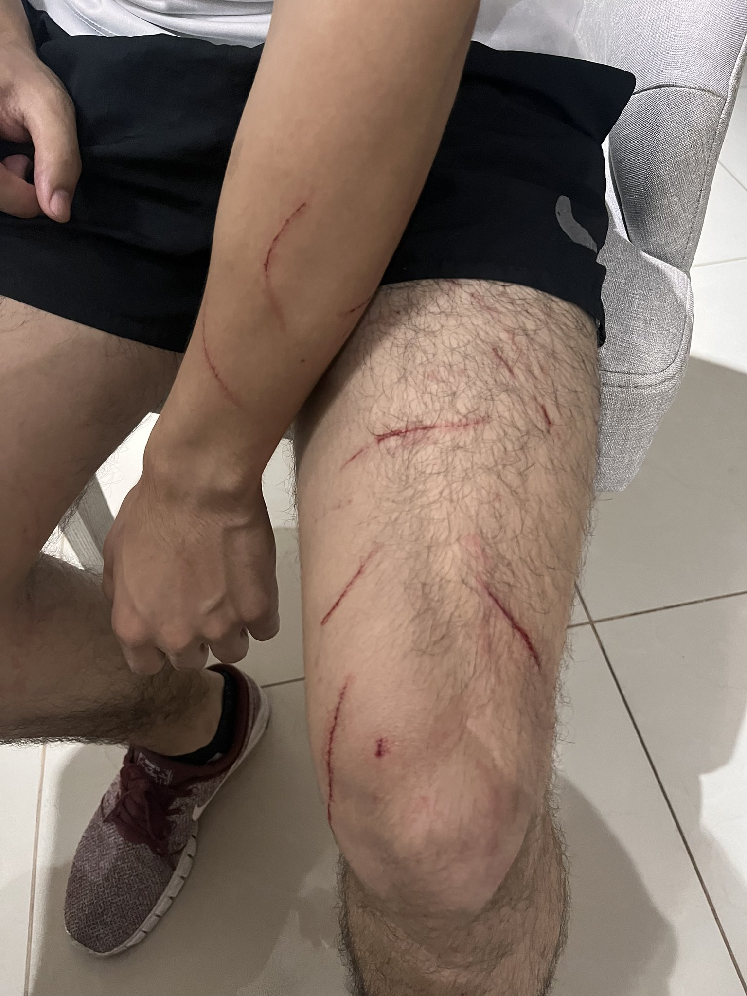 La denuncia del joven estuvo acompaña por una fotografía en la que son visibles los resultados del ataque sufrido. En la imagen, se perciben las múltiples heridas que el atracador le propinó tanto en su pierna como en su brazo en medio del intento de robo.