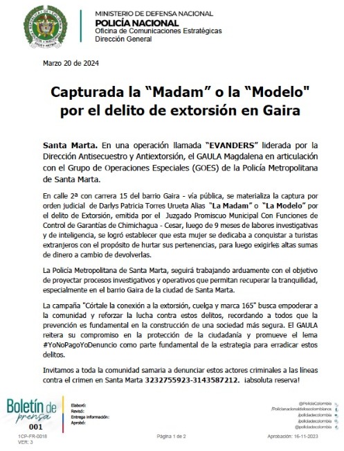 En una operación liderada por la Dirección Antisecuestro y Antiextorsión, el GAULA Magdalena en articulación con el Grupo de Operaciones Especiales (GOES) de la Policía Metropolitana de Santa Marta, en el sector de Gaira en plena vía pública, fue capturada una mujer identificada como Darlys Patricia Torres Urueta, alias «La Madam» o «La Modelo», por el delito de Extorsión.