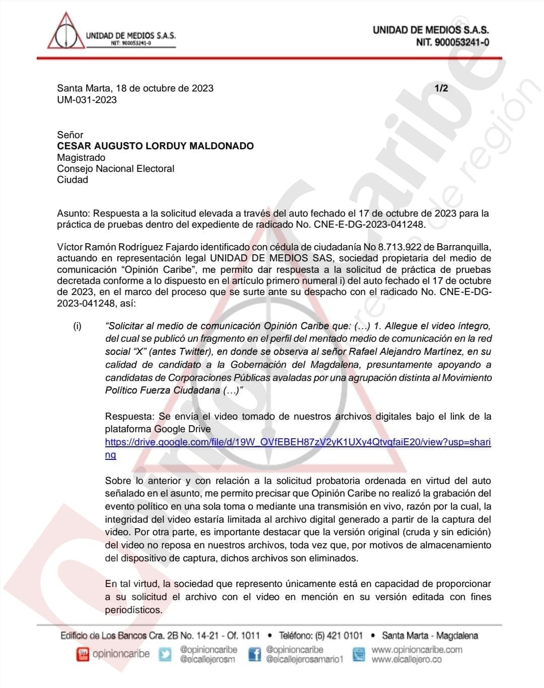 Dos semanas después, el 17 de octubre de 2023, OPINIÓN CARIBE es vinculado formalmente al proceso: el CNE solicitó mediante un escrito el aporte del video completo donde está contenido el segmento en que Rafael Martínez aparece solicitando apoyo para candidatas al Concejo de Santa Marta y Asamblea del Magdalena afiliados a partidos diferentes al suyo, con listas propias a estas dos corporaciones. La petición buscaba verificar la autenticidad y contenido del material, trasladado en su integridad por este medio un día después de la petición.