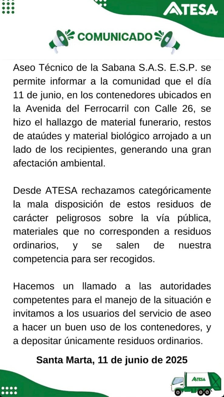 La empresa Aseo Técnico de la Sabana S.A.S. E.S.P. (ATESA) a través de un comunicado informa a la comunidad que en horas de la mañana de este 11 de junio se registró un preocupante hallazgo en los contenedores de residuos ubicados en la Avenida del Ferrocarril con Calle 26.