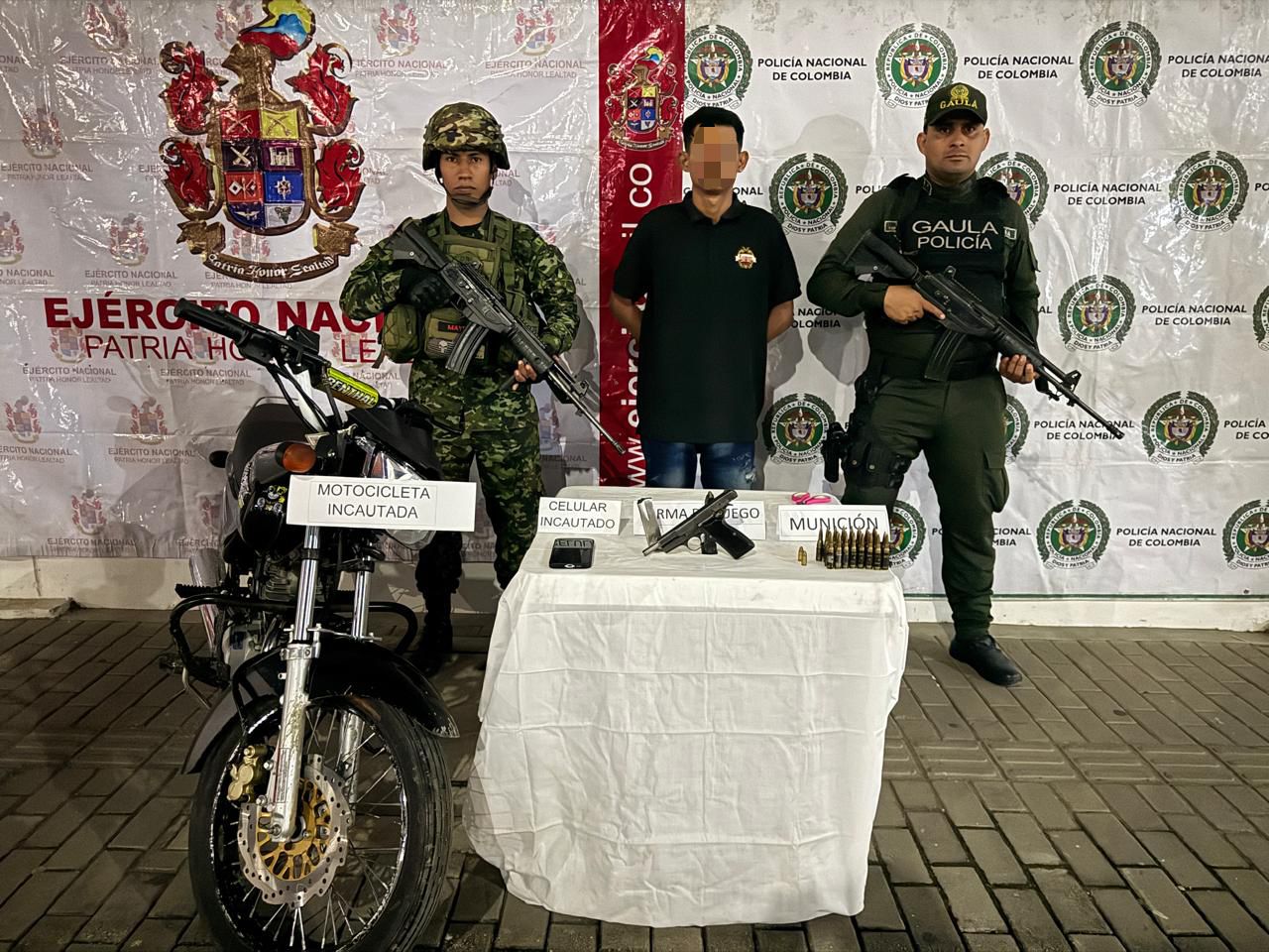 Durante el procedimiento, los uniformados hallaron en poder del detenido un arma de fuego tipo pistola, municiones de diferente calibre y una motocicleta, los cuales fueron incautados como material probatorio.