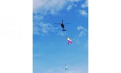 Cuando realizaban un tremendo espectáculo al término de la Fiestas de la Flóres en Medellín, dos soldados quienes sostenían abiertamente la bandera de Colombia ?? desde...